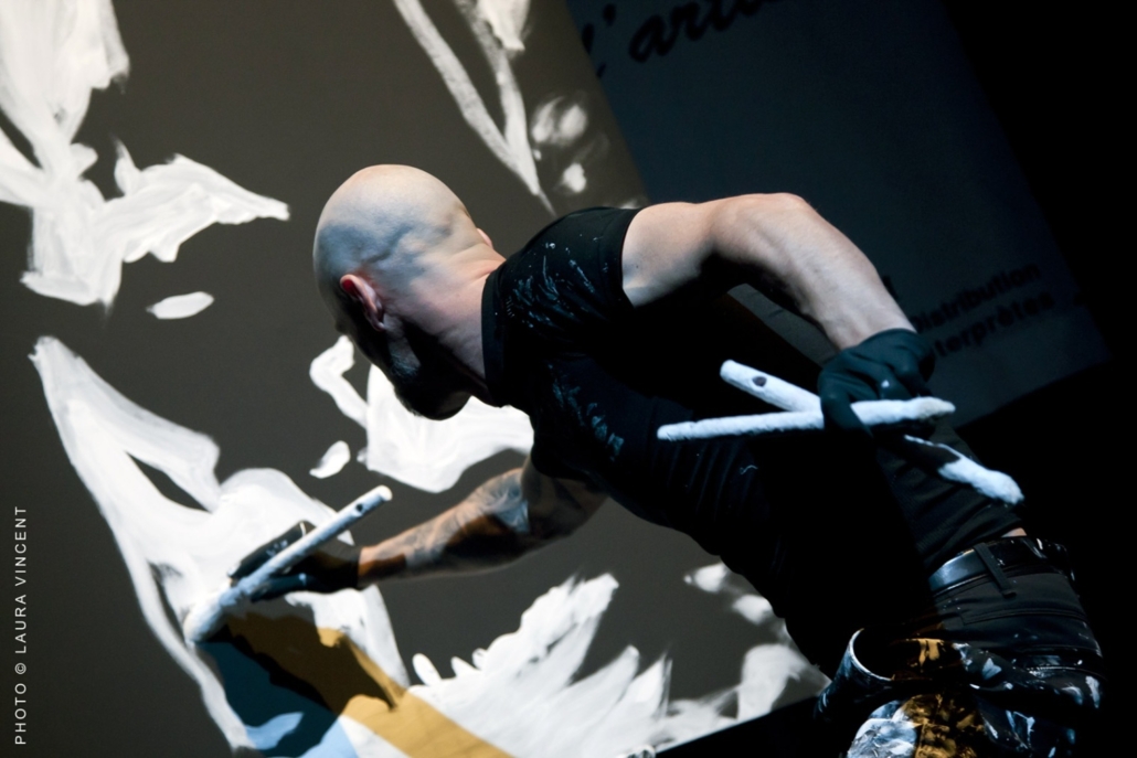 Si ses premières projections de peintures sur scène démarre en 1993, c’est en 2005 que le peintre performer Rénald Zapata débutera sa collaboration interrompue avec L’Estival en proposant ses performances de peintures en direct.